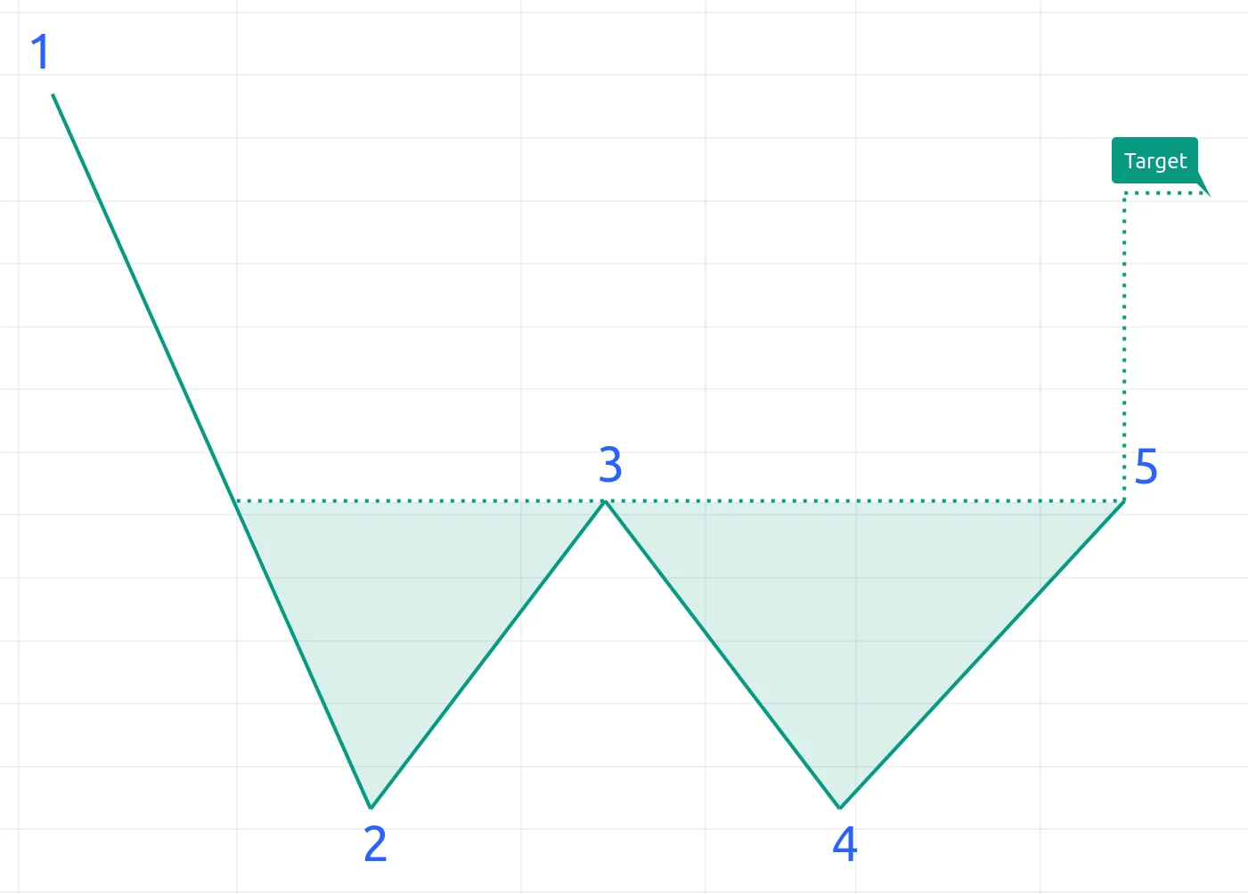 The Double Bottom is the inverse of the Double Top and is a bullish reversal pattern. It forms after a downtrend and consists of two consecutive troughs that are approximately at the same price level, with a moderate peak in-between, forming a 'W' shape. The pattern is confirmed when the price rises above the "resistance level" (the highest point of the peak). This typically suggests that the asset's price is set to rise further, often at least the same vertical distance as the height between the double bottoms and the resistance level.